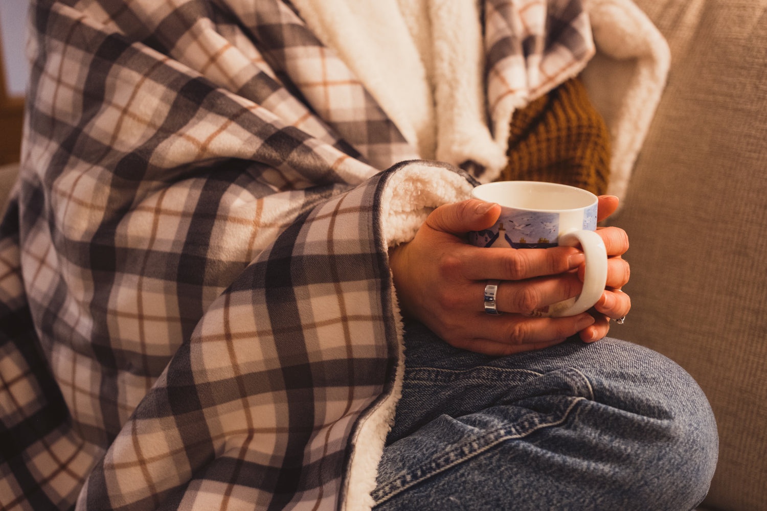 Velvet on one side, sherpa on the other. She pulls it from the sofa arm, tucks it around herself, and the day releases its grip. This dusky blue and mocha blanket is designed for exactly that moment.